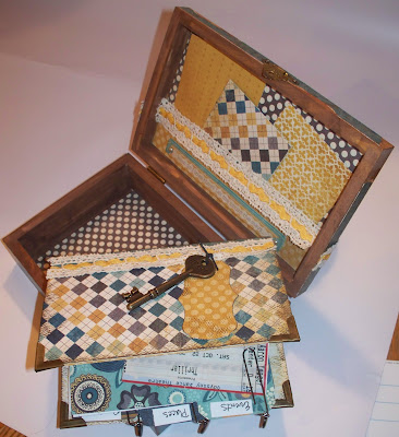 10. Cut a strip of paper from Hattie "Buddies" Argyle paper from My Minds Eye to fit across the box, and about 1 1/2 inches tall. Glue another piece of the May Arts Ribbon - Crochet Ivory, and the yellow ric-rac across that top. I added a My Minds Eye Stella and Rose Gertie You and Me layered sticker. I put adhesive on 3 sides, leaving the top open and stuck it to the inside of the lid, creating a pocket. In the picture you can see there are some matching journaling cards in there, but you could also put pictures, ticket stubs, or other fun memorabilia poking out.